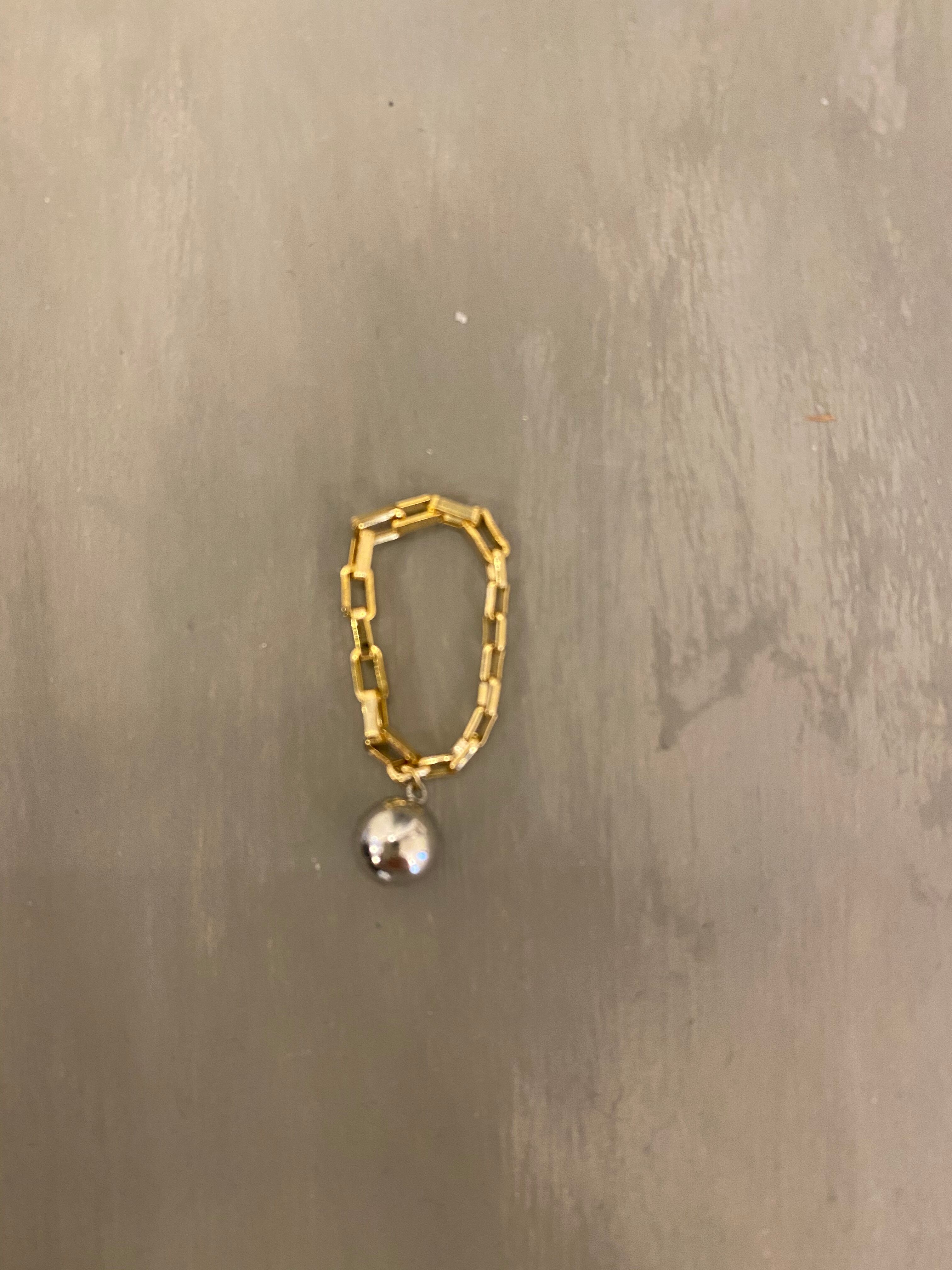 2種類のチェーンのcombinationにメタルボールがついた個性的で存在感のあるリングです。